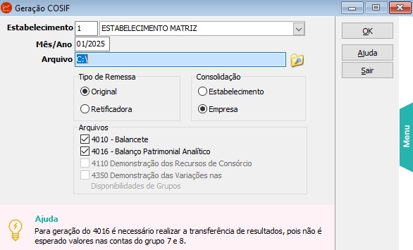 Esta rotina gera o arquivo para o Sistema COSIF - Consolidação do Plano Contábil das Instituições do Sistema Financeiro.