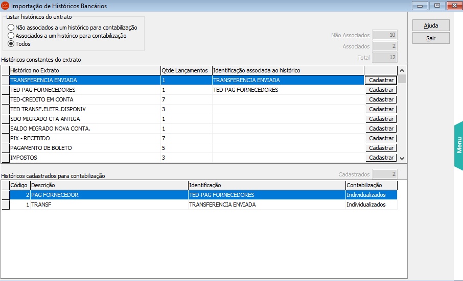 É possível visualizar todos os históricos constantes do extrato, ou somente aqueles que estão ou não associados a um histórico do sistema.