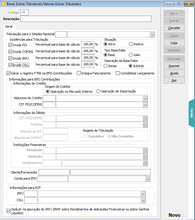 Importante: Para que as informações preenchidas nesta tela sejam levadas corretamente para EFD Contribuições, é essencial que seja feito o cadastro dessas informações por meio do menu Cadastros > Genéricos > Bases Extras Tributáveis/Valores Extras Tributados.